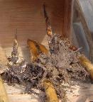 手をシャベル代わりに使い、泥をかき分けて竹の根を掘りだし、鎌、鑿、小刀で根を切り取る。手が泥んこのすさまじさでした。