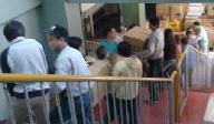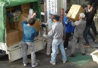 階段に向かい合って並び、手渡しで運び上げる。かなり重い物も混じる。大きなダンボ-ル箱は手が滑って持ちにくい。ポランテイアの皆さん、作業所の職員、障害をもった仲間も協力して頑張る。