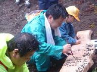 栗の木で作られた記念プレ-トに記名する、白猪綾部市議会議員。