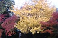 黄金に輝く大銀杏、紅葉のモミジが寄り添う