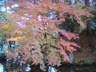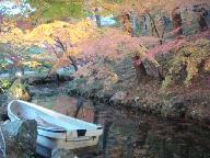 ボートが浮かんでいる、紅葉の対岸は大八洲神社