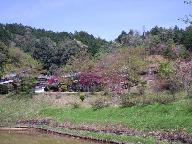 二本の桜のしたに「大原の産屋」が建っていた。国道R173にある公園から写す。冬の写真と大変趣が違う。