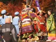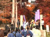 大勢の沿道の参観者の声援に送られて安国寺に着きました。産湯の井で市長止まるかと思いましたが素通り、石段、山門など付き人の後姿の撮影です。文化財の仏殿、床几に腰掛けておられ紅葉と撮りました。