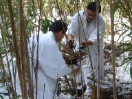 相根良一志賀郷和会長に案内していただいて「御ミノシベ」の説明を聞き、山や谷に見立てた高低のある竹林と方角など、注連縄を張り巡らされた「御ミノシベ」を一周しながら「わせ」「なかて」「おくて」の竹の子を指さして教えていただき、その生え具合、「お刈り」が済んだ後の竹の子の色、艶の見方などを教わった。写真を撮っていると頭上の大木から大きな雪の固まりが落ちてきて被り驚いた。