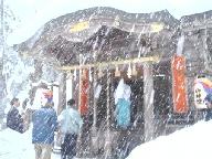 3日朝は、前夜の積雪が踏みしめられて氷結した上に、薄く新雪が舞う最悪の路面となり、テカテカ、つるつるの道を中学生が滑りながら登校する有様で、急坂でトラブリ、タイヤチェンを付けて金河内まで走行することとなった。遅刻する旨を梅垣正一志賀郷地区自治会連合会長に電話し、着いたときは10時半前で「茗荷田」の刈り取りは終わっていて、拝殿の前に一同が集まられ、大志万昌次宮司から「茗荷占い」の解説を聞かれているところであった。 降りしきる雪の中でお祓いが行われ、登尾峠の登山などでお世話になった相根良一志賀郷和会長などの皆様、梅垣和夫体協評議員(テニス)など知っている地元の方々とお会いし、甘酒の接待をいただいた。
