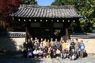 妙心寺山門、仏堂、法堂をバックに2号車の皆さん。京都スカイガイド:下村貞夫さん、バスガイドさんと共に記念写真撮影。