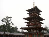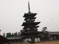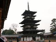 各層に裳階(もこし)をつけているため六重に見えますが三重の塔です。この特異な形が、全体として律動的な美しさを保ち、“凍れる音楽”という愛称で親しまれています。相輪の頂上に取り付けられた水煙は4枚からなり、その中には24体の飛天か透かし彫りされています。