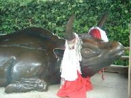 子供が川で遊んでいる大きな織物の中央部の図柄