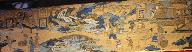鯉山を飾るタペストリーは、ホメロス作ギリシャ神話「イーリアス」をもとに、16世紀にフランドル地方ブラバン州(現在のベルギー)で製作された5枚シリーズのうちの1枚です。17世紀、伊達政宗の家臣である支倉常長が、遣欧使節としてローマ法王に謁見したおり、法王から政宗への贈物として日本に持ち帰られました。その後5枚のタペストリーは会津藩の手に渡り、うち3枚が会津天寧寺を通じて京都の天寧寺に運び込まれたといわれています。そしてその1枚を鯉山町が購入し、大小9枚に分断して、右図のように、鯉山飾りとしました。