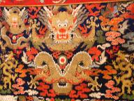 水引は,雲龍文様の繻珍(しゅちん)。前掛は伝萬歴帝御服(でんばんれきていぎょふく)(1989)復元。胴掛は百華文の綴錦。見送は宝暦十四年(1764)記銘の牡丹鳳凰文様綴錦(ぼたんほうおうもんつづれにしき)と紅地唐子遊図(べにじからこゆうず)の二種類が隔年交替で用いられる。