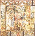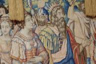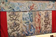 ●このタペストリーは、16世紀中期現在のベルギー・ブリュッセルで製作され、図柄は、紀元前1200年頃のトロイ戦争(ギリシャとトロイの戦い)を題材としたギリシャ詩人ホメロスの叙事詩「イーリアス」中の重要な場面での、トロイ王の英姿です。もとは写真のように一枚の織物としてつくられました。