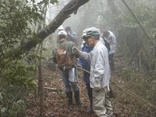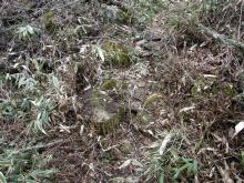 | 川端先生:山岳仏教の話 | 西照寺 井戸跡?凹み | 何か見つかった様子 | 礎石?平坦な丸石が | 藪の中を検分しながら |