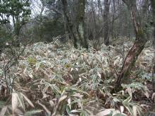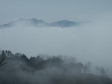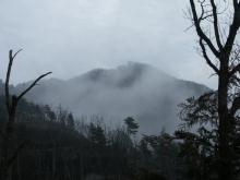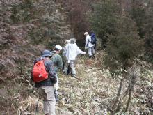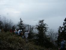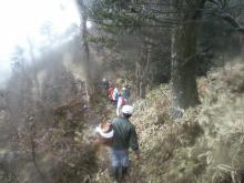 | 十倉区との山境くい | 霧が晴れてきた | 蓮ケ峰下の反射板を望む | 頭巾山・天狗畑が見える | 谷を渡って |
