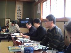 | 白い方の水鳥拡大 | 似鯉も泳いでいる | ミ−ティング待機中 | 豚汁の接待も | 町井さまと講師の先生方 |