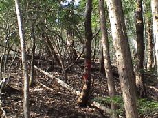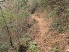 3/12(金)やまあそ様 HP「山であそぼっ」の制作者見峯山行者堂:柵の中の錫杖をもった石仏です。 鳥居をくぐれば、そびえ立つ大岩の並ぶ谷に出てしまい踏み跡をよじ登って行者堂。 △蛇ケ谷も途中行き帰りとも少し迷いました。 貴殿の地図にある「難しい分岐」で迷いに迷い右往左往、雑木の密生でコ−スもままにならない中で、GPSの受信状況が悪く、コ−スポインタ−は全く当てにならず、ポイント距離も数値がくりくり変わる不安定状態。ピ−ク付近に白木のまだ新しい杖が刺してあり持ち帰りました。 拡大コピ−の地図とコンパスでコ−スを定め、やっと峠に到着。昼前になり無理をせずにここで下山。 下山路は、谷沿いのしっかりした山道でした。和木深山不動さんは谷の向こう側に登る道が見え、別の谷水のようです。上の林道の大看板に出ました。 高台の村へ戻る道も、前回下調査で歩いた林間の終点谷をUタ−ンするル−トがありました。 胸や腰を超す倒木と雑木のジャングルをMTBで縦走走破されるとは、まさに怪神(貴公子)ですね。いろいろと、ご指導有り難うございました。 次回、下山路から△中ノ谷を再トライします。 |