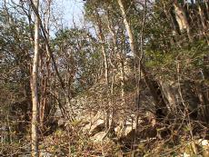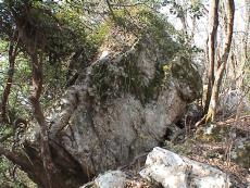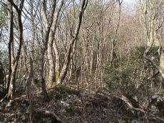 | 足下が腐り倒れた 裏に峠道 | 峠から西に登り始める | 大岩が見えると頂上間近 | 白い岩石が多い |