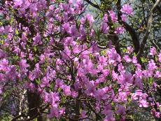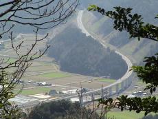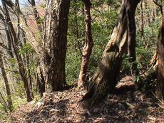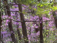 志賀郷から府道物部西舞鶴線を東に走ると、京都縦貫自動車道の陸橋が横切っている。坊口トンネルの上に続く山が岳山。一般の道路地図にも載っている。 陸橋の手前を坊口川に沿って北に入ると長松寺がある。地形図を見ながら登山口を探して三ヶ所ほど候補地を見つけ、長松寺前に引き返したところで二人の村人に出会い確認できた。 長松寺前の道をそのまま登り詰めた所が登山口で、少し入ると鳥居と山の神さん?があった。山道は葛籠折れで北西に上がっており、左からの合流もあった。 全山、紫色の山つつじが咲き誇り、さながらつつじのトンネルを登る状態であった。 山道は枯れ枝が落ちたり、倒木が横たわり、崩れ場もある程度であったが、舞鶴に越える稜線に出て、尾根道を西に辿るとかなり下生えで迂回する状態になった。 麓からも見え、村人が東光坊さんと呼ぶ木立が頂上の少し東にあり、村と京都縦貫高速道が眼下に一望できた。ここへは年に1回程度登るとの事であった。岳山の眺望はあまりなかった。 |
