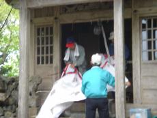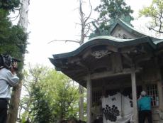 | 展望所のお地蔵さんにも | 準備の吉田さま | 金峰山神社(頂上)内陣 | 幕が張られた ビデオ取材中 |