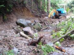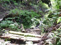| 林道造成中 | 赤と青テ−プから登る | 作業用山道 | 丸太橋がかかる |