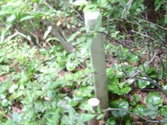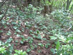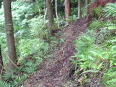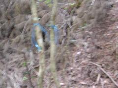 最高に面白かった登山です。ユンボが更に進んでいましたが、谷を渡り、青とピンクのテ−プに出て、えっこれを上がるのと思いましたが、手袋とズボンを泥んこにしながら、濡れた岩や木の根に掴まって上がり、作業山道の折り返しでした。下から上がる道があるなんて!細い丸太を3本渡した橋、恐くて渡れません。ここも橋の上部の岩を巻いておっかなびっくりで越しました。ツヅラ折れで上り下りするアップダウンの多い、長い長い道でした。 結局また谷に降りて渡るのでした。それから崩土を巻いて尾根に上がり・・自然林を満喫しながら、ようやく鳩ケ峰頂上に立ちました。 下りは、笹藪の中を通る若丹国境尾根でしたが、途中から妻谷尾林道に降りてしまい、しばらくうろうろした後。p474に登り直し、小雨に遭いましたが、見当で尾根まで藪こぎして登り、管の坂峠でした。そこでまた下りが分からず、降りたり登ったり尾根を東西に移動したり・・迷いました(ふじもと様によると天国のような下り道とのこと:GPSの設定間違いで少し降りてまた登ってしまいました) 最終的に地図とコンパスで方向を決め、道なき道を谷に降りました。一度滑って転び地図ケ−スと帽子を谷に落とし、GPSは手に持ってましたが、カメラが谷に飛び込んだ音がしたので、自分も谷に滑り落ちて追っかけました。結局石で、カメラはポケットにあり無事でした。それで、谷を降りて来ました。下調査の地点の随分先に出て生還しました。 |