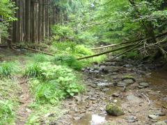 | 尼公谷に引き返し沢渡り | 沢沿いの山道 | 右に左に沢渡り | 倒木の下を沢渡り |