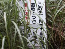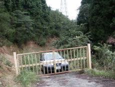 | 道が削れ、路肩の落石も | ゲ−トに鉄塔工事作業者の車 | 林道の標識 | 舗装された道で頂上へ | すすきがきれい |
