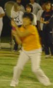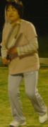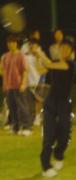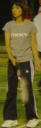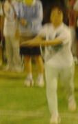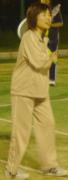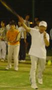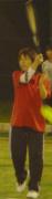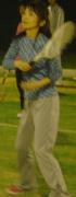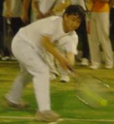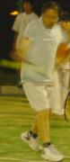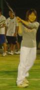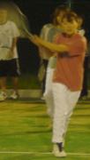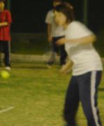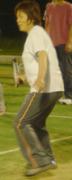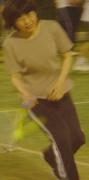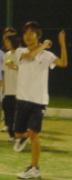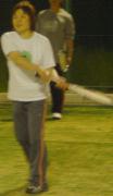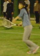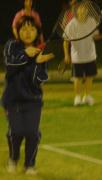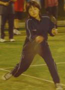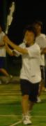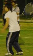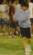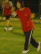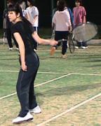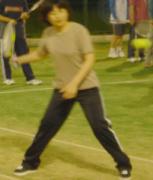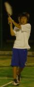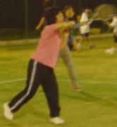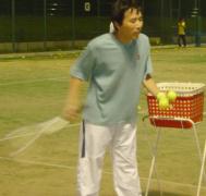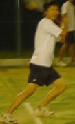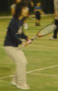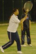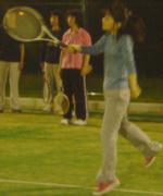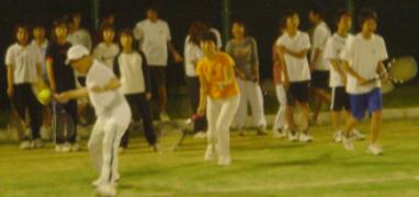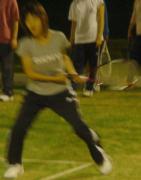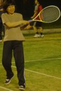 お断り:夜間照明とカメラ内蔵フラッシュで写真撮影していますので、明るさをガンマ補正し、また遠距離とスロ−シャッタ−のため、ラケットがぶれています。タイミングも遅れての撮影で、もっと良いフォ−ムでの撮影を期待された受講生の皆様には、大変申し訳なく感じています。ウェアの色なども、日中の写真にはとても及びませんね。