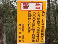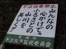 | 止めよう峠道のゴミ不法投棄!軽自動車程度の標識あり、車を置いて歩く、しかし全線舗装で普通車でも行けそうな感じ。 あとで聞くと、対向車があると、すれ違い出来ず、待避場所がないので軽自動車程度とのこと。 安場町不法投棄監視委員会など、警察署、綾部市、京都府の警告看板多数にも関わらず「ゴミ不法投棄」が各所で目立つ。 地図で見ると標高250m程かかなりの距離があった。家族のハイキングコ−スにも、ただし展望は木の間から程度。 途中通行者なく全くの無人状態であった。 |