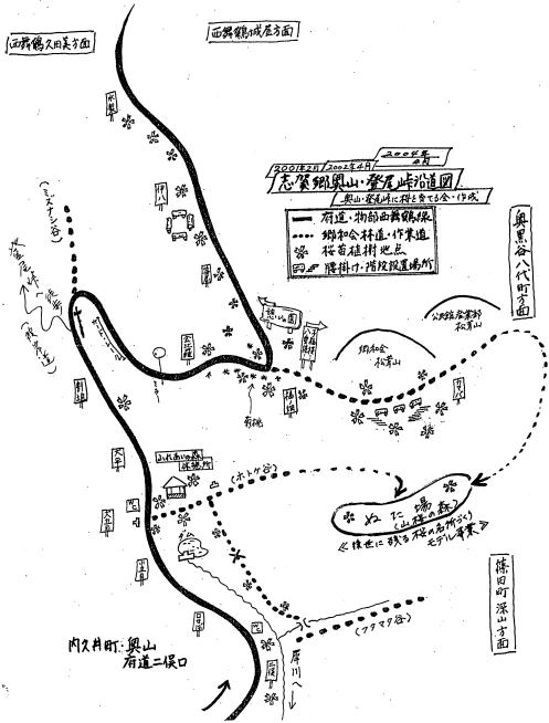 | 登尾峠の登山口は、内久井から府道を奥に進み、「犀川ダム」「ふれあいの森休憩所」「割迫」を過ぎ、U字形に府道がカ−ブする「水なし谷」少し手前に、赤いリボンを先端に巻いた棒が立てられている。(公団看板もあり)この谷から山にはいると、谷を渡り右に斜行する「彼岸道」を登る。林間にはいると道は少し広くなり、すぐに黄色い境界杭の立つ境界尾根に到達する。「自然石の道標」は、城屋へ向かう少し先にある。 |