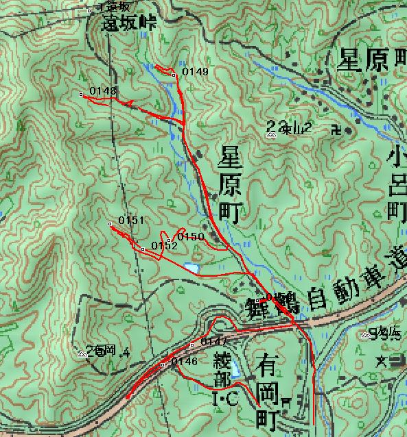 ![]() 2次探索:小呂町経由の星原町からのルート探索を近日中に実行する。 3次探索:遠阪峠を抜けて白道路に到着できない場合は、白道路からのルート探索を行う。 ・星原町の村落を北上し林道に入る。2叉路の左は草の茂る舗装路。ポイント0148で舗装の終点、山道が続く。(写真参照) ・遠阪峠は手前の頭上に高圧線が通るあたりで北上の必要あり。分岐路および高圧線に気付かなかった。再調査の必要あり。 ・2叉路の右は草の生える地道。ポイント0149で引き返す。(写真参照) ・有岡町内の市道をそのまま進むと、高速道有岡インターを迂回して、高速道路のガード下を潜る車道がある。潜り抜けた所のポイント0146に△有岡(251.37m)に上る登山口が開いている。 ・探索の帰路、△有岡の北側のルートを探したが。大池に続く林道であり少し方向違いであった。(ポイント0152の小橋ルートの写真参照) |