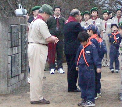 ![]() ボ−イスカウト少年隊に授与する四方名誉団長(市長) |