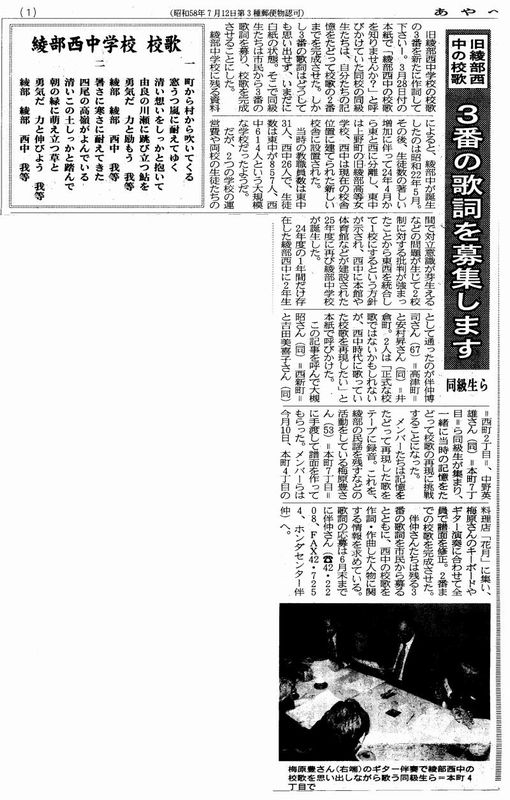 この1月に、同級生の四方淳策君から電話をいただき、前の綾中の校歌を知らないかと云うことであった。知らないと返事をしたが、実は西中の存在自体を意識したことがなかった。1学年上の昭和26年卒(当時西中2年生)の伴仲博司さま達のご努力で、綾部西中校歌が収録されたとの、あやべ市民新聞の報道が掲載された。